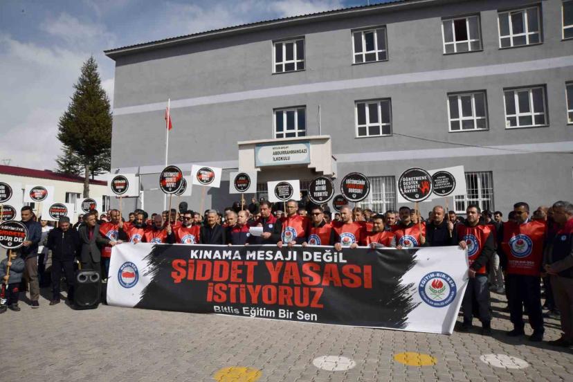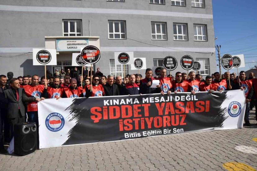 Eğitim Bir Sen Bitlis Şubesi de saldırıyı protesto etmek amacıyla olayın yaşandığı Abdurrahman Gazi İlkokulu önünde basın açıklaması yaptı. Sendika yönetiminden Abdurrahman Yaşasın tarafından okunan açıklamada, "Ahlat’ta görev yapan okul müdürü üyelerimize yönelik gerçekleştirilen menfur saldırıyı kınamak, eğitim camiasına yönelen şiddete karşı duruşumuzu göstermek ve dayanışmamızı ifade etmek üzere bir araya gelmiş bulunuyoruz. Eğitim kurumları; bilginin, emeğin, sabrın ve geleceğin inşa edildiği kutsal mekânlardır. Bu kurumların yöneticileri ve çalışanları ise toplumun yarınlarını yetiştirmek gibi ağır bir sorumluluğu omuzlarında taşıyan fedakâr insanlardır. Böylesine kutsal bir görevi yerine getiren eğitim yöneticilerine yönelik şiddetin hiçbir gerekçesi olamaz ve hiçbir şekilde kabul edilemez. Ahlat’ta okul müdürü üyelerimize yönelik gerçekleştirilen saldırı yalnızca bireylere yapılmış bir saldırı değildir. Bu saldırı; eğitime, kamu hizmetine, devlet otoritesine ve toplumun ortak değerlerine yönelmiş açık bir tehdittir. Eğitim çalışanlarının görevlerini huzur ve güven ortamı içerisinde yerine getirememesi, doğrudan doğruya geleceğimizin zarar görmesi anlamına gelmektedir. Şiddeti meşrulaştıran ve sorun çözme yöntemi olarak gören anlayış toplumsal barışa zarar vermekte, kamu düzenini zedelemektedir. Eğitim kurumlarında görev yapan yöneticilerimizin ve öğretmenlerimizin güvenliği sağlanmadan sağlıklı bir eğitim ortamından söz etmek mümkün değildir. Nitekim Eğitim-Bir-Sen’in girişimleriyle Öğretmenlik Meslek Kanunu’nda eğitimcilere yönelik şiddet suçlarına verilen cezalar artırılarak caydırıcılık güçlendirilmiştir. Bizler eğitim çalışanları olarak sorunların diyalogla, hukuk çerçevesinde ve karşılıklı anlayışla çözülmesi gerektiğine inanıyoruz. Şiddetin hiçbir türünü kabul etmiyor, eğitim camiasına yönelen her türlü saldırının karşısında kararlılıkla durduğumuzu bir kez daha ifade ediyoruz. Yetkili mercilerden beklentimiz; bu saldırının tüm yönleriyle araştırılması, sorumluların hukuk önünde gerekli cezayı alması ve benzer olayların tekrar yaşanmaması için caydırıcı tedbirlerin ivedilikle hayata geçirilmesidir. Eğitim çalışanlarının güvenliğinin sağlanması yalnızca bireysel bir hak değil, aynı zamanda kamusal bir zorunluluktur. Bugün burada sergilediğimiz birlik ve dayanışma, eğitim çalışanlarının yalnız olmadığının en güçlü göstergesidir. Eğitim camiasına yönelen her türlü saldırının karşısında durmaya, meslektaşlarımızın yanında olmaya ve hukuki sürecin takipçisi olmaya devam edeceğiz. Unutulmamalıdır ki; eğitim çalışanına uzanan el, toplumun geleceğine uzanmış sayılır. Bu vesileyle saldırıya maruz kalan okul müdürü üyelerimize geçmiş olsun dileklerimizi iletiyor, kendilerine ve tüm eğitim camiasına geçmiş olsun diyoruz. Şiddetin olmadığı, güvenli ve saygı temelli bir eğitim ortamı için mücadelemizi kararlılıkla sürdüreceğiz" dedi.