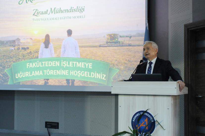 Törenin açılış konuşmalarını gerçekleştirerek sözlerine Antalya ve çevre illerde meydana gelen yoğun yağıştan etkilenen çiftçilere geçmiş olsun dileklerini ileterek başlayan Akdeniz Üniversitesi Ziraat Fakültesi Dekanı Prof. Dr. Mustafa Erkan, "Gelecekte tarımsal üretimde herhangi bir sıkıntıya uğramadan tüm ülkelerin en stratejik politikaları arasında yer alan tarımsal üretimin tüketicilere ulaştırılması amacından teknolojinin kullanılmasının zorunlu olduğunu görmüş olduk. Bu nedenle bugün aramızda olan ve bir yarıyıl sonra mezun olacak olan siz ziraat mühendisleri bu görevi yerine getirecek ve Türkiye’de tarımsal üretim kesintiye uğramadan tüketicilere ulaştırılmasında en yetkin rolü oynayacaksınız. Fakültemizde özellikle Antalya’da ki tarımında potansiyelini dikkate alarak 7+1 uygulamalı eğitim modeline geçtik. Özellikle Türkiye’nin 124 firmasından toplam 225 öğrencimiz sahaya çıkacak. Bunun dışında 42 öğrencimizi Antalya dışına uğurlayacağız. Bir öğrencimizi de Erasmus kapsamında Polonya’da staja gönderiyoruz" dedi.
