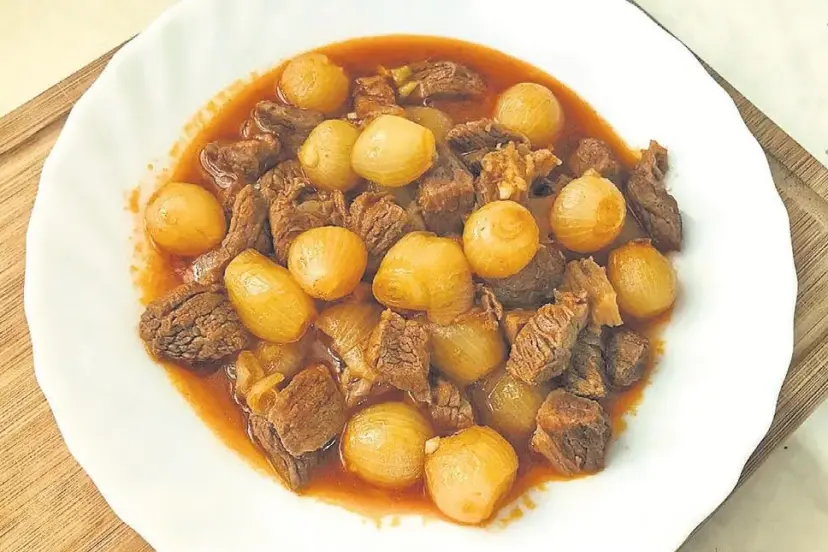 YAPILIŞI: Yağları tencereye alalım. Tereyağ eridiğinde yıkayıp, süzdüğümüz etleri ekleyip, harlı ateşte 2-3 dakika karıştırarak, kavuralım. 1 yemek kaşığı sirke, 1 çay bardağı sıcak su ekleyip, kapağını kapatalım. Orta ateşte ara ara karıştırarak pişirelim. Suyu biten etlere arpacık soğanlarını ve sarımsakları ekleyelim. Etlerle beraber 2-3 dakika kavuralım. Salça ilave ederek 2-3 dakika daha kavurup üzerini geçecek kadar su ekleyelim. Tuz ve karabiber ekleyip, arpacık soğanlar yumuşayana kadar pişirelim.