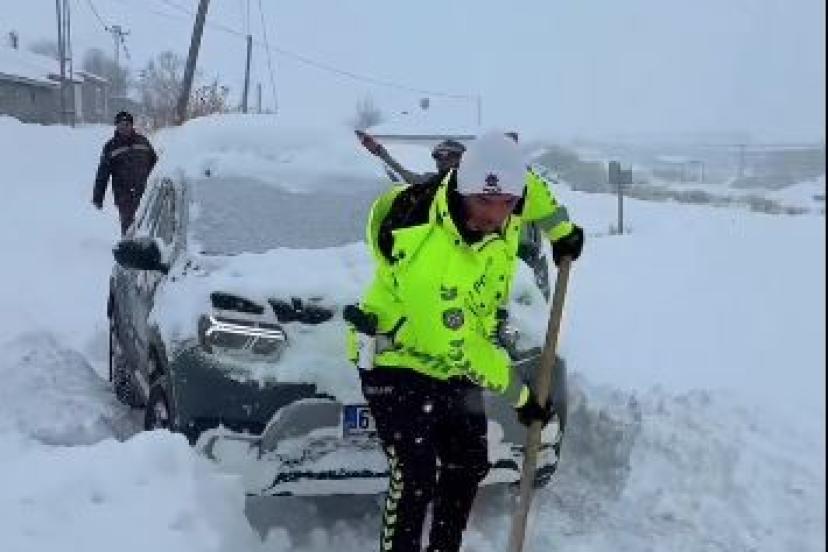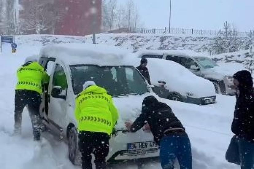 Ardahan’da İl Emniyet Müdürlüğü’ne bağlı Trafik Şube Müdürlüğü ekipleri, kar yağışı ve buzlanma nedeniyle yolda kalan araçların kurtarılmasında sürücülere yardım etti.