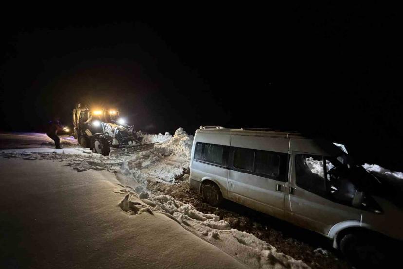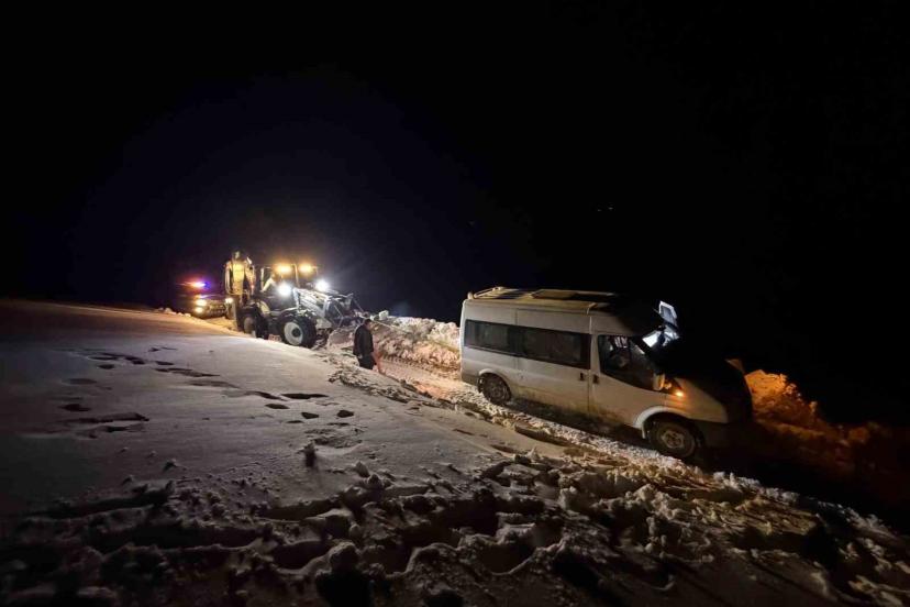 Van’ın Başkale ilçesinde kar yağışı ve tipinin etkisiyle yoldan çıkan minibüs kar birikintisine saplandı.