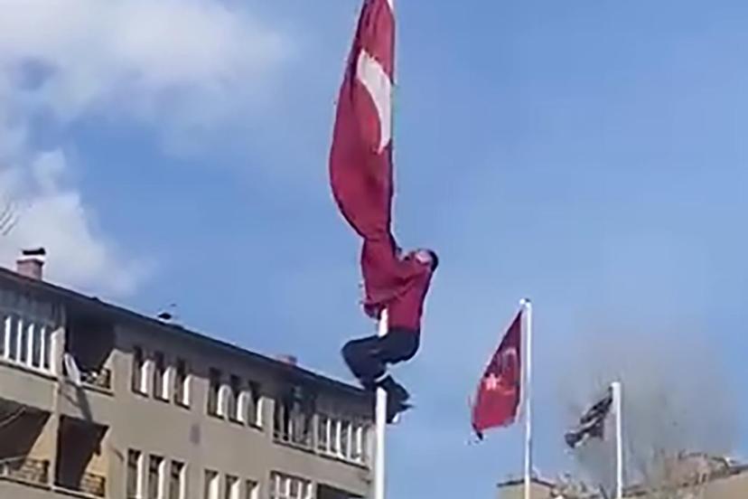 Erzurum’da akaryakıt istasyonunda çalışan Doğuş Güngör şiddetli rüzgar nedeniyle dolanan Türk bayrağını 15 metrelik direğe tırmanarak düzeltti.