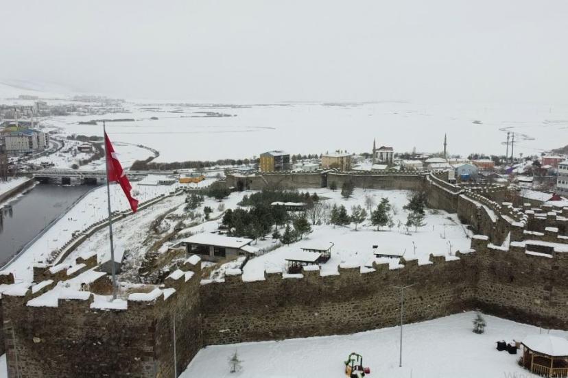 Kalenin beyaz örtü ile kaplanmış hali havadan görüntülendi.