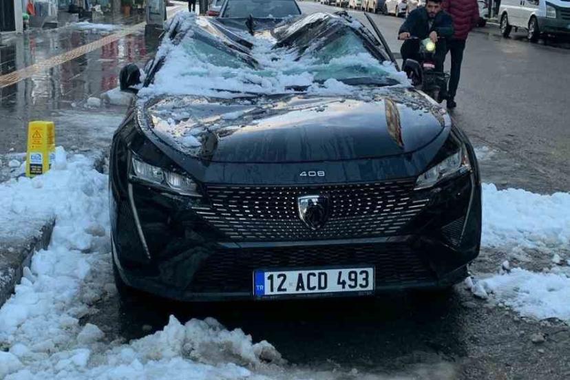 Bingöl’de havaların yumuşaması ile çatıdan düşen kar kütlesi park halindeki araca zarar verdi.