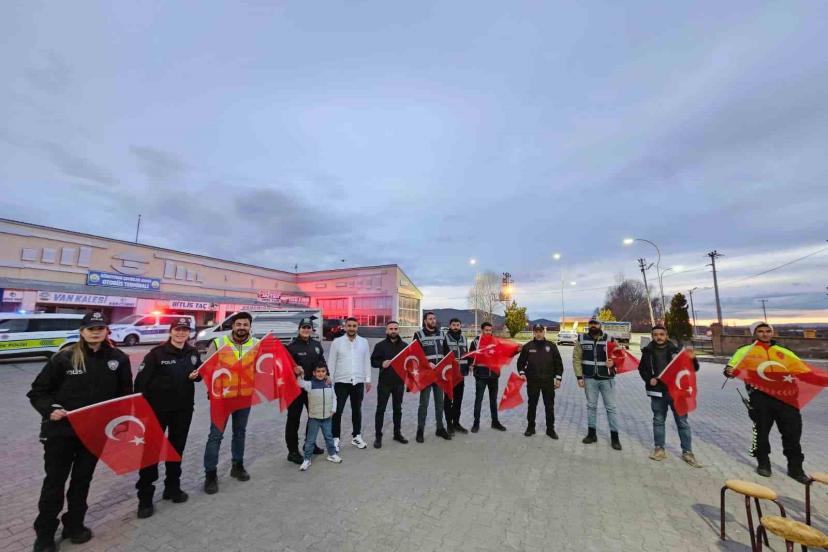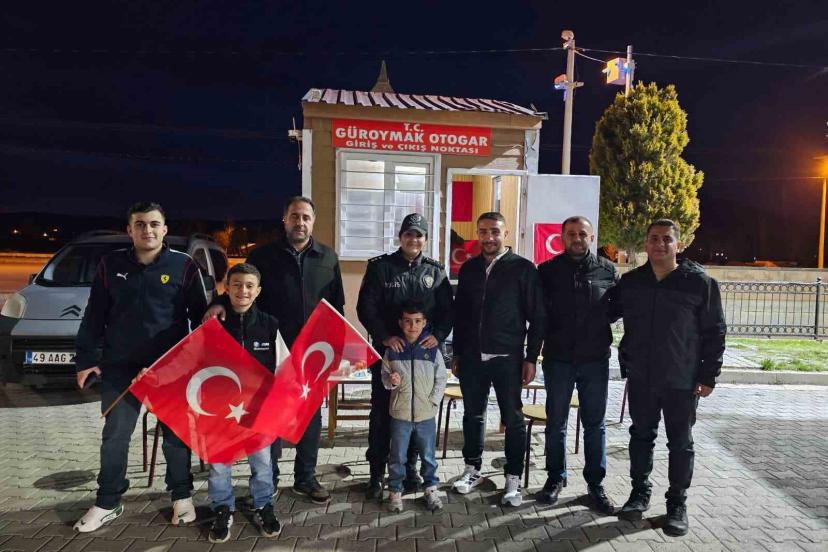 Güroymak Şehirler Arası Otobüs Terminali’nde yazıhane işletmeciliği yapan Şenol Gez, ilçede görev yapan polis ekipleri için sürpriz bir organizasyon düzenledi. Otogarda kavga olduğunu ihbar eden Gez, gelen polisleri ellerinde Türk bayrakları bulunan çocuklarla birlikte karşıladı.