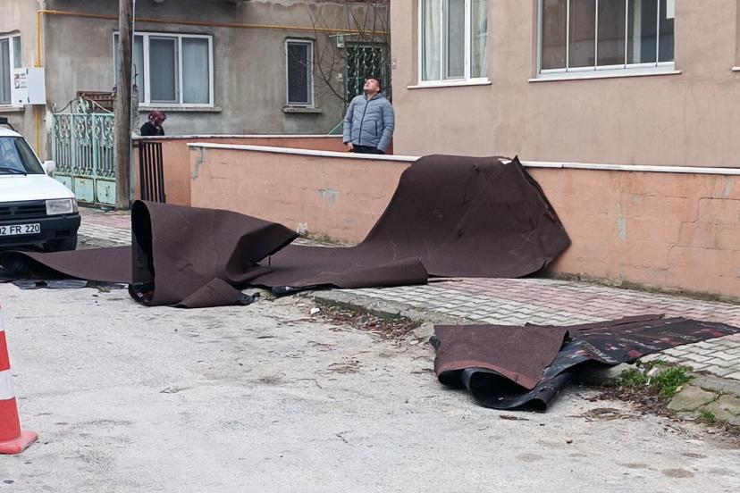 BURDUR'da şiddetli rüzgar nedeniyle çatıdan kopan yalıtım malzemesi sokaktaki elektrik tellerine asılı kaldı.