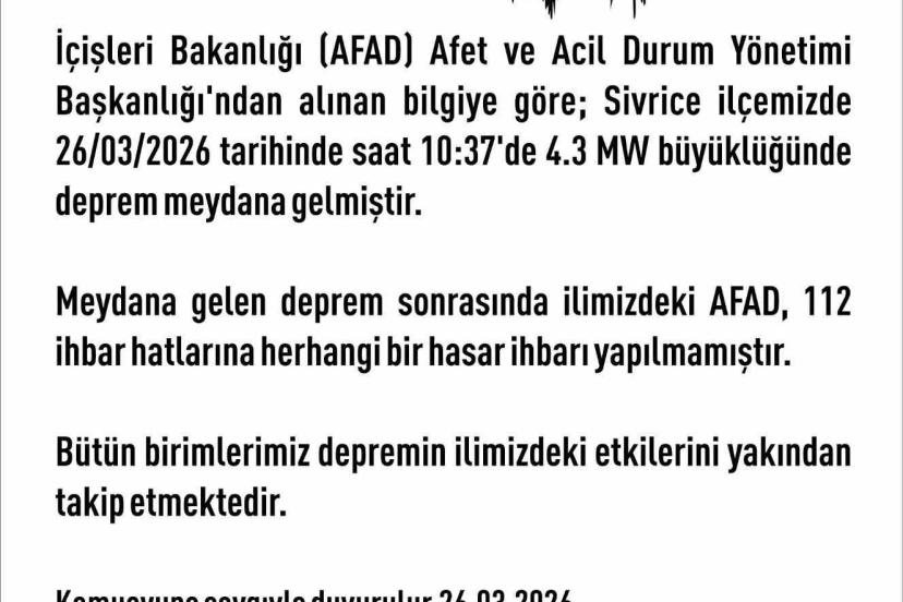 Yapılan açıklamada, "İçişleri Bakanlığı (AFAD) Afet ve Acil Durum Yönetimi Başkanlığı’ndan alınan bilgiye göre; Sivrice ilçemizde 26/03/2026 tarihinde saat 10:37’de 4.3 MW büyüklüğünde deprem meydana gelmiştir. Meydana gelen deprem sonrasında ilimizdeki AFAD, 112 ihbar hatlarına herhangi bir hasar ihbarı yapılmamıştır. Bütün birimlerimiz depremin ilimizdeki etkilerini yakından takip etmektedir. Kamuoyuna saygıyla duyurulur" denildi.