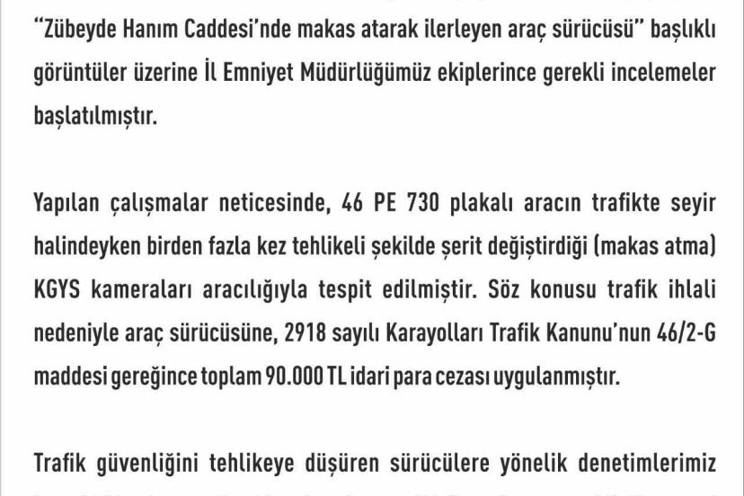 Denetimlerin kararlılıkla süreceğini açıklayan Elazığ Valiliği, "21 Mart 2026 tarihinde saat 19.19’da sosyal medya platformlarında paylaşılan ’Zübeyde Hanım Caddesi’nde makas atarak ilerleyen araç sürücüsü’ başlıklı görüntüler üzerine İl Emniyet Müdürlüğümüz ekipleri tarafından gerekli incelemeler başlatılmıştır. Yapılan çalışmalar neticesinde, 46 PE 730 plakalı aracın trafikte seyir halindeyken birden fazla kez tehlikeli şekilde şerit değiştirdiği (makas atma) KGYS kameraları aracılığıyla tespit edilmiştir. Söz konusu trafik ihlali nedeniyle araç sürücüsüne, 2918 sayılı Karayolları Trafik Kanunu’nun 46/2-G maddesi gereğince toplam 90 bin TL idari para cezası uygulanmıştır. Trafik güvenliğini tehlikeye düşüren sürücülere yönelik denetimlerimiz kararlılıkla devam etmekte olup, benzer ihlallere karşı gerekli tüm cezai işlemler titizlikle uygulanacaktır" denildi.