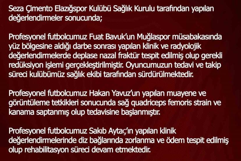 Elazığspor sağlık heyetinden yapılan yazılı açıklamada; "Profesyonel futbolcumuz Fuat Bavuk’un Muğlaspor müsabakasında yüz bölgesine aldığı darbe sonrası yapılan klinik ve radyolojik değerlendirmelerde deplase nazal fraktür tespit edilmiş olup gerekli redüksiyon işlemi gerçekleştirilmiştir. Oyuncumuzun tedavi ve takip süreci kulübümüz sağlık ekibi tarafından sürdürülmektedir. Profesyonel futbolcumuz Hakan Yavuz’un yapılan muayene ve görüntüleme tetkikleri sonucunda sağ quadriceps femoris strain ve kanama saptanmış olup tedavisine başlanmıştır. Profesyonel futbolcumuz Sakıb Aytaç’ın yapılan klinik değerlendirmelerinde diz bağlarında zorlanma ve ödem tespit edilmiş olup rehabilitasyon süreci devam etmektedir. Söz konusu üç futbolcumuz, devam eden tedavi süreçleri nedeniyle Sincan Belediyesi Ankaraspor ile oynanacak müsabakanın maç kadrosunda yer alamayacaktır" denildi.