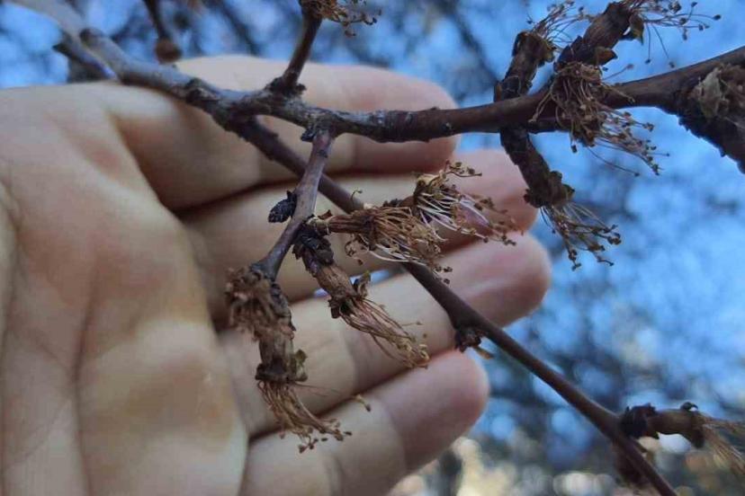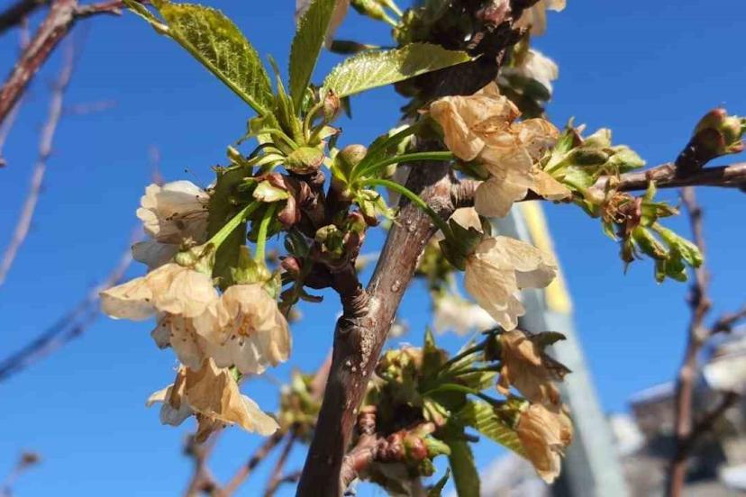 Zirai donun etkisiyle kayısı ağaçlarının beyaz çiçek yapraklarının uç kısımlarında kahverengiye dönüşüm gözlemlendi. Ağaç dallarındaki bu renk değişimi, don olayının etkisini ortaya koydu.