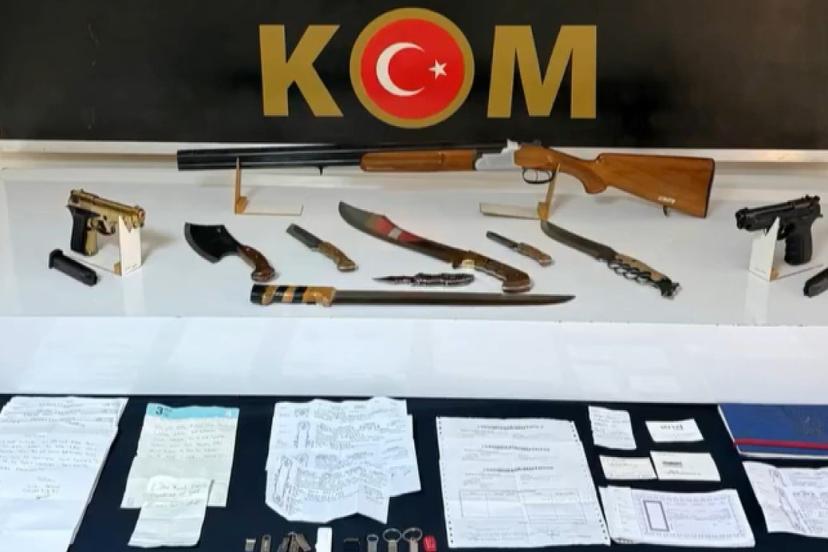 Kaçakçılık ve Organize Suçlarla Mücadele Şube Müdürlüğü ekiplerince şüphelilerin yakalanmasına yönelik ikamet, iş yeri ve araçlarda yapılan aramalarda 2 kurusıkı tabanca ve şarjörleri, 1 ruhsatsız tüfek, 7 kesici-delici alet ile çek, senet, çeşitli dokümanlar ve dijital materyaller ele geçirildi.