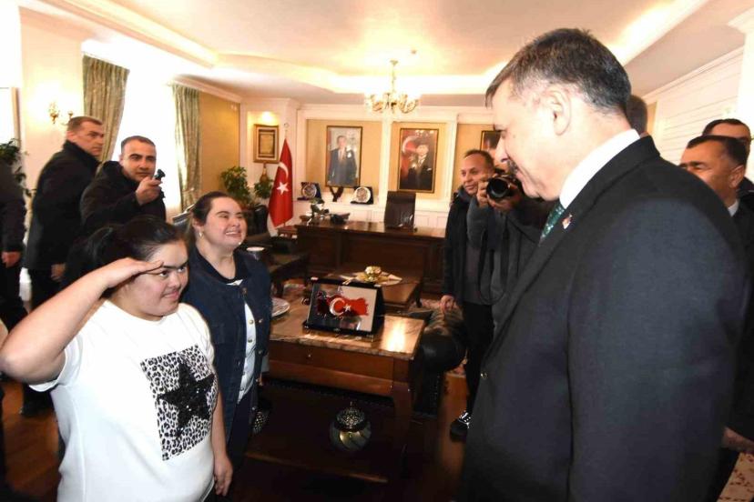 İçişleri Bakanı Mustafa Çiftçi, bakanlık öncesi görev yaptığı Erzurum Valiliği sırasında "Valiliğimizin gülleri" olarak adlandırdığı down sendromlu özel çocuklar Çağla Okyay ve Elif Ademoğlu ile valilik girişinde selamlaştı.