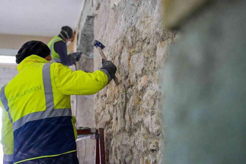 Uzman ekipler, titizlikle sıvaları sökerek tarihi taş dokuyu gün yüzüne çıkarırken binanın özgün mimarisinin korunmasına yönelik çalışmaların devam ettiği bildirildi.