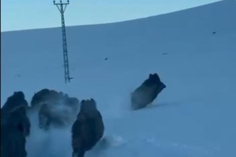 Merkeze bağlı Akyaka köyü yolunda sabah saatlerinde otomobiliyle seyreden Vedat Özgür’ün önüne aniden bir domuz sürüsü çıktı. Yol boyunca ilerleyen domuzlar bir süre aracın önünde koşarak ilerledi. Sürücü Özgür ise hayvanlara zarar vermemek için aracın hızını düşürerek ilerledi. Bir süre sonra yol kenarındaki karla kaplı alana yönelen domuzlar gözden kayboldu. Yaşanan ilginç anlar sürücünün cep telefonu kamerasıyla kayıt altına alındı.