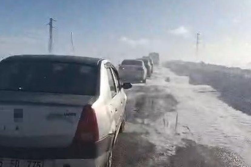 Kars’ta şiddetli tipi nedeniyle Kars-Göle karayolunda onlarca araç yolda mahsur kaldı.