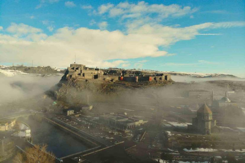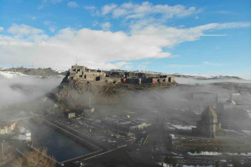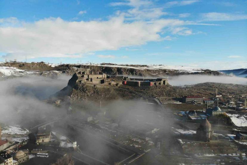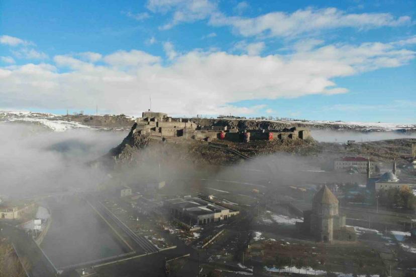 Kent merkezine hakim konumda bulunan Kars Kalesi, sis bulutlarının arasında zaman zaman görünmez hale geldi. Aynı karede yer alan tarihi kilise ve Evliya cami ise sisin arasından siluet şeklinde belirdi. Ortaya çıkan görüntüler, kentin tarihi dokusunu farklı bir atmosferle buluşturdu.