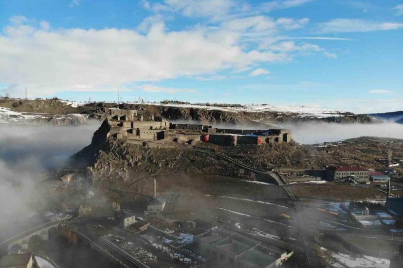 Kars Kalesi, sabah saatlerinde etkili olan yoğun sisin içinde adeta kayboldu. Kars’ta sadece kale etrafında etkisini gösteren sis, tarihi yapıları gizlerken ortaya kartpostallık manzaralar çıkardı.