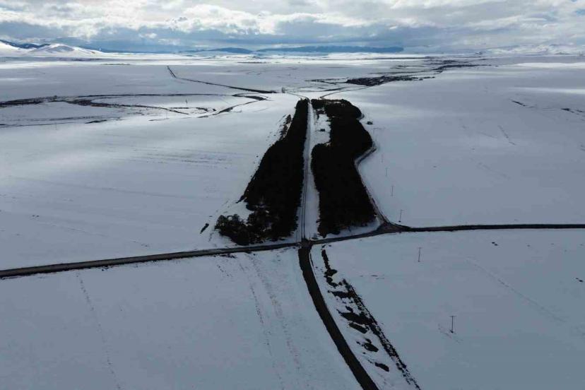 Bölgedeki geniş tarım arazileri de yoğun kar yağışından nasibini aldı. Bahar ekim sezonuna hazırlanan tarlalar, kalın kar tabakasıyla tamamen örtülerek adeta beyaz bir denizi andırdı. Havadan çekilen görüntülerde, karla kaplı arazilerin geometrik yapısı dikkat çekerken, doğanın sakinliği görenleri büyülüyor.