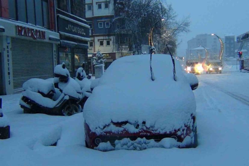 Kars’ta dün akşam saatlerinde başlayan ve şiddetini artırarak devam eden kar yağışı, kentte hayatı durma noktasına getirdi. Gece boyu aralıksız süren yağış sonrası şehir merkezi beyaz örtüyle kaplanırken, park halindeki araçlar kara gömüldü.