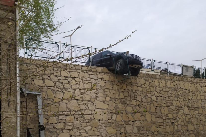Kontrolden çıkan araç istinat duvarında asılı kaldı