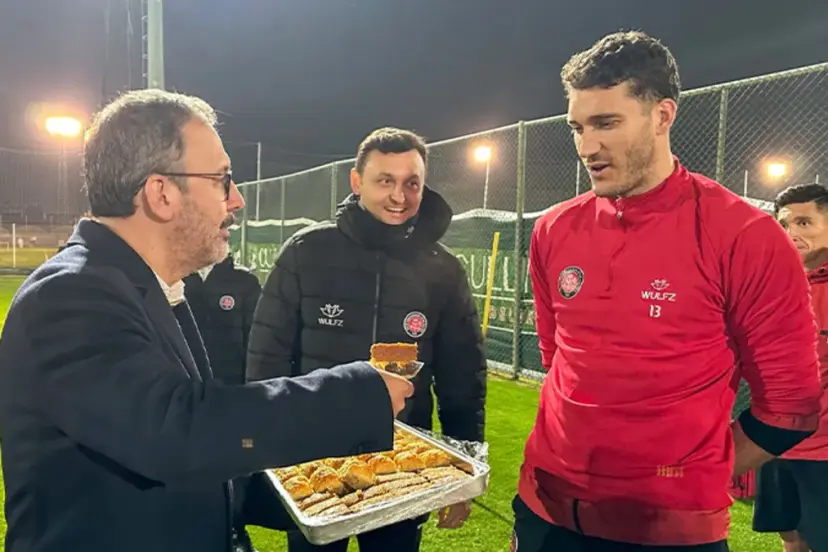 Akşam antrenmanında teknik direktör Aleksandar Stanojevic ve oyuncularla sohbet eden Kasapoğlu, takıma baklava ikram etti.