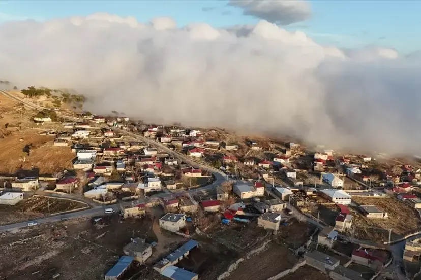Görüntülerde evler, yollar, cami ve mahalle meydanının sis bulutuyla bütünleşen manzarası yer aldı.