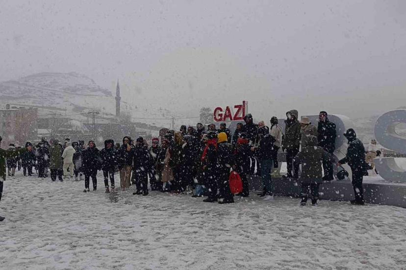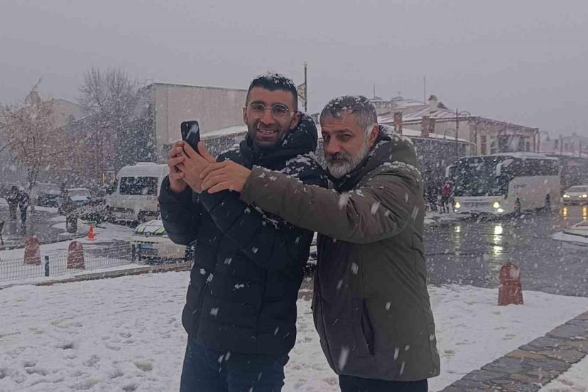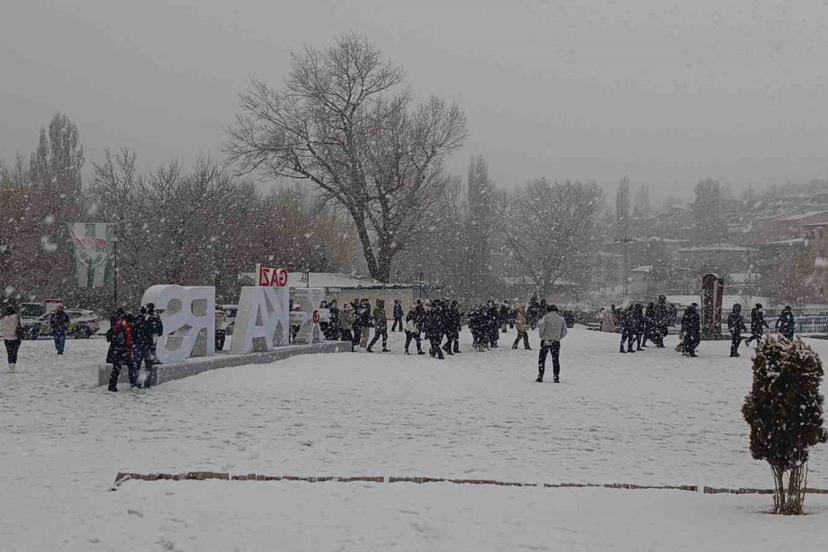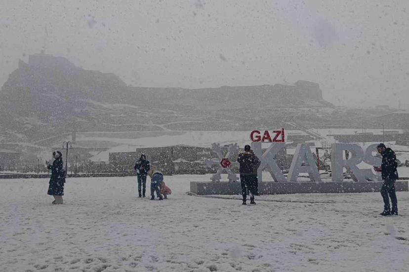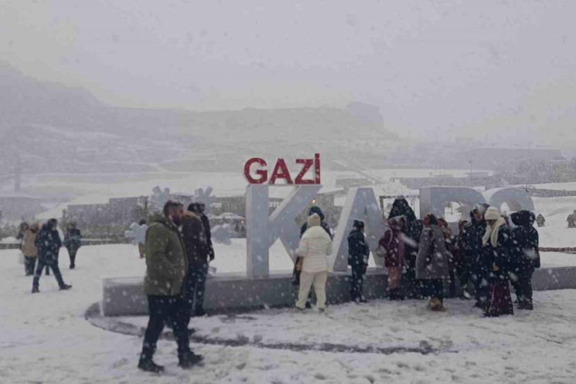 Kars’ta gün boyu etkili olan güzel hava, akşam saatlerinde yerini kar yağışına bıraktı. Bir anda lapa lapa yağan kar, vatandaşları sokaklara döktü. Özellikle kente Turistik Doğu Ekspresi ve tur acenteleri aracılığıyla gelen vatandaşlar, Bedesten bölgesine akın etti. "Kars" yazısı önünde kaleyi arkalarına alarak sevdikleriyle birlikte bol bol fotoğraf çekilen vatandaşlar karın keyfini çıkardı.