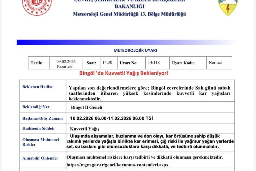Meteoroloji 13. bölge Müdürlüğünden yapılan açıklamada," Bingöl il genelinde Salı (10.02.2026) günü sabah saatlerinde itibaren yüksek kesimlerde yoğun kar yağışı beklenmektedir. Ulaşımda aksamalar, buzlanma ve don olayı, kar örtüsüne sahip düşük rakımlı yerlerde yağışla birlikte kar erimesi, çığ riski ile yağmur yağan yerlerde sel, su baskını gibi olumsuzluklara karşı dikkatli, ve tedbirli olunmalıdır" denildi.