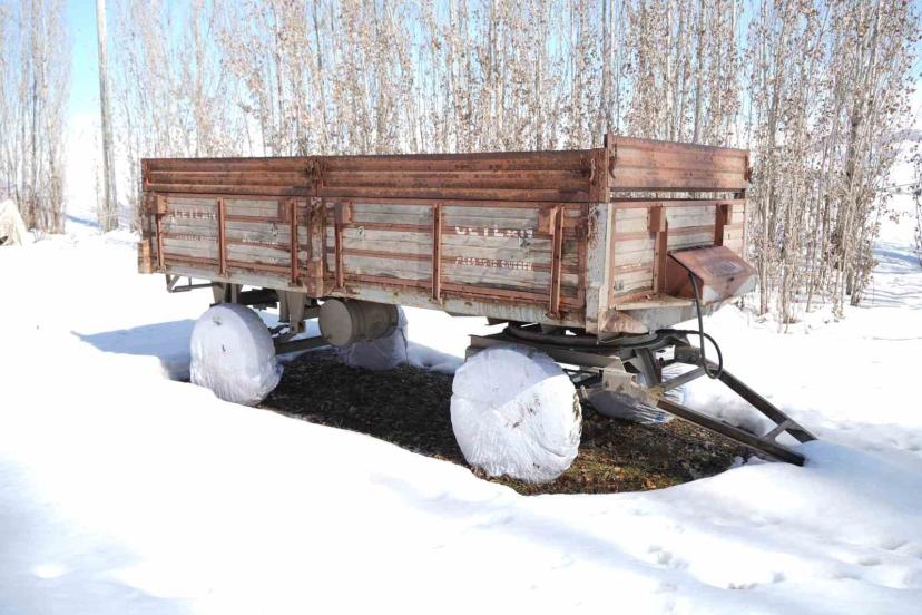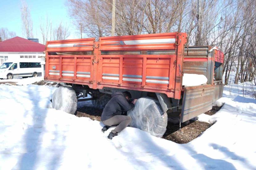 Muş’taki çiftçiler, dondurucu soğukların tarım araçlarına zarar vermemesi için traktör ve römork lastiklerini çeşitli yöntemlerle koruma altına alıyor.
