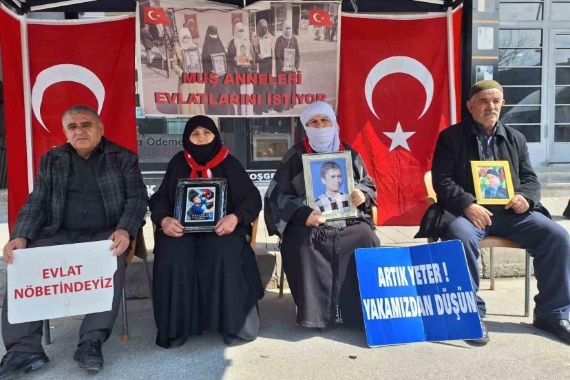 Muş’ta DEM Parti İl Başkanlığı önünde evlat nöbeti tutan aileler, çocuklarına teslim olmaları için çağrıda bulundu.