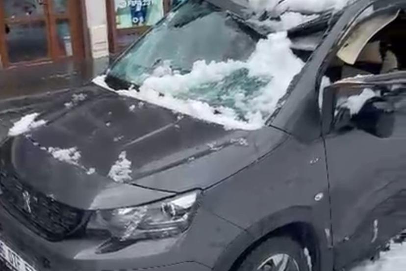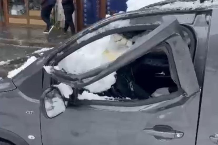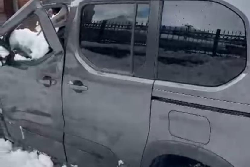 Bitlis’te park halindeki bir aracın üzerine çatıda biriken kar kütlesi düştü.