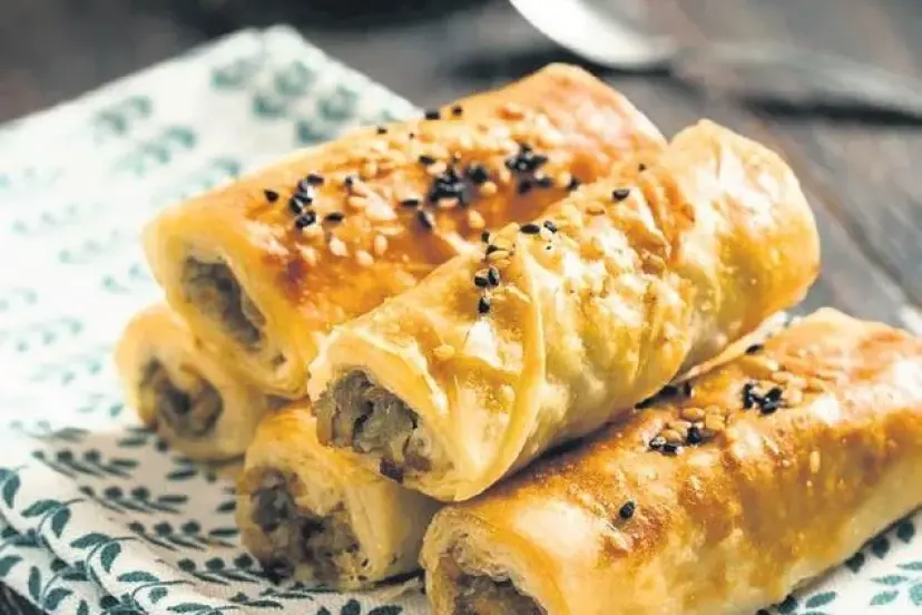 YAPILIŞI: İnce kıyılmış soğanı yağda kavuruyoruz. Kıymayı ekledikten sonra suyunu çekinceye kadar kavuruyoruz. Baharat, maydanoz ve tuzu ilave edip, biraz karıştırıp ocaktan alıyoruz ve soğumaya bırakıyoruz. Süt, maden suyu ve sıvı yağı bir kapta iyice karıştırıyoruz. Yufkayı şekildeki gibi serip, karışımdan sürüyoruz. Yarım daire şeklinde katlayıp bu kısıma da karışımdan sürüyoruz. Kıymalı harçtan uzun kısıma koyarak rulo şeklinde katlıyoruz. Dört eşit parçaya bölüp, yağlanmış ya da kağıt serilmiş tepsiye diziyoruz. Diğer yufkalara da aynı işlemi uyguluyoruz. Kaşık yardımıyla kalan sosu her birinin üzerine döküyoruz. Tepsiyi buzdolabına kaldırıp, 2 saat kadar bekletiyoruz. Üzerine yumurta sarısı sürüp önceden ısıtılmış 180 derece fırında kızarana kadar pişiriyoruz.