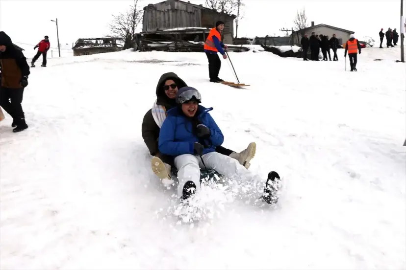 Yaylaya gelen ziyaretçilerin horon oynayarak eğlendiği şenlikte, bazı vatandaşlar da naylon poşetler ve kayak malzemeleriyle kaymaya çalıştı.