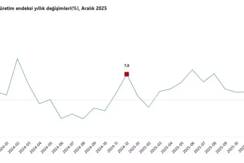TÜİK, Aralık 2025'te sanayi üretiminin yıllık %2,1 azaldığını, aylık %1,2 arttığını açıkladı. Madencilik sektörü %1,9, elektrik ve gaz sektörü ise %2,4 artış gösterdi.