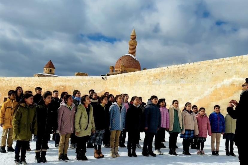 "Maarifin Kalbinde Ramazan" etkinliği kapsamında öğretmen ve öğrenciler, İshak Paşa Sarayı ve Ağrı Dağı etekleri başta olmak üzere ilçenin önemli noktalarında ilahiler seslendirdi.