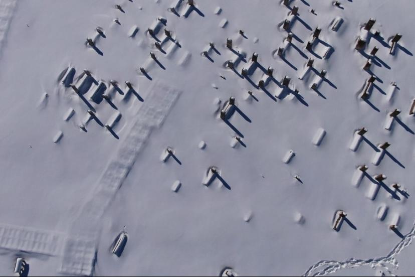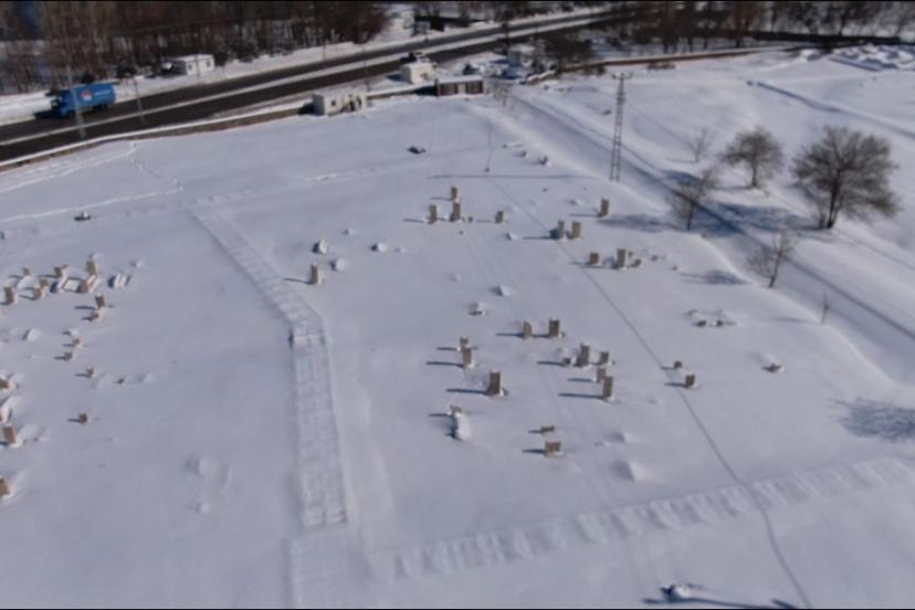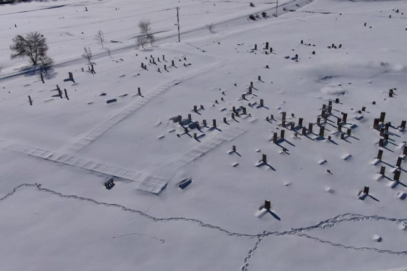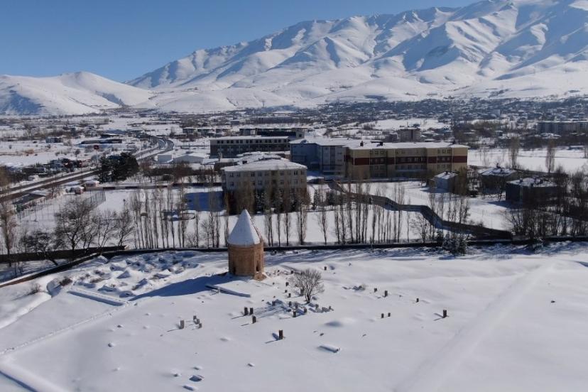 Kar yağışı sonrası Gevaş ilçesindeki Selçuklu Mezarlığı beyaza büründü. Halime Hatun Kümbeti’nin de bulunduğu yaklaşık 50 dönümlük alanda, işleme ve yazılarıyla öne çıkan mezar taşları karla kaplandı. Mezar taşları, Halime Hatun Kümbeti, Artos Dağı’nın karla kaplı manzarası ile Van Gölü’nün mavi suları havadan görüntülendi.